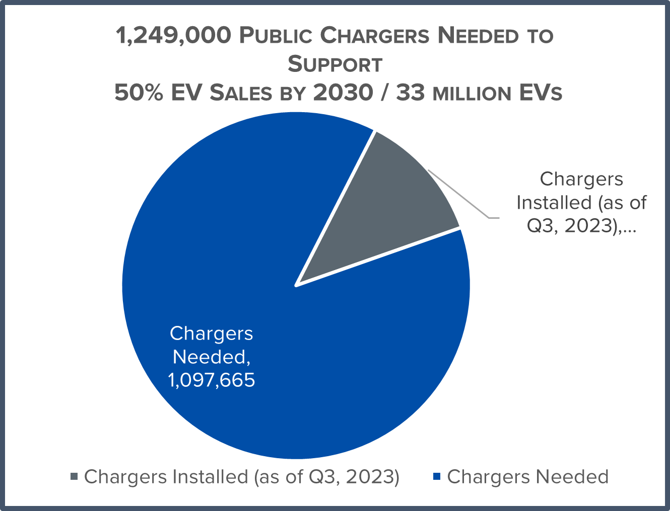 - Nearly 1.1 million more public chargers (950,000 Level 2 and 147,000 DC Fast) are required to meet the National Renewable Energy Laboratory’s necessary infrastructure estimate for 2030;