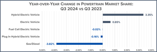- EVs represent 10.6 percent of new light-duty vehicle sales in Q3 2024, up from 9.96 percent in Q2 2024 and 10.13 percent in Q3 2023;