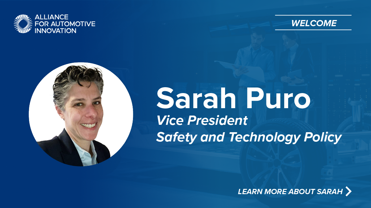 WASHINGTON, DC – Alliance for Automotive Innovation today announced Sarah Puro as Vice President, Safety and Technology Policy, effective immediately.