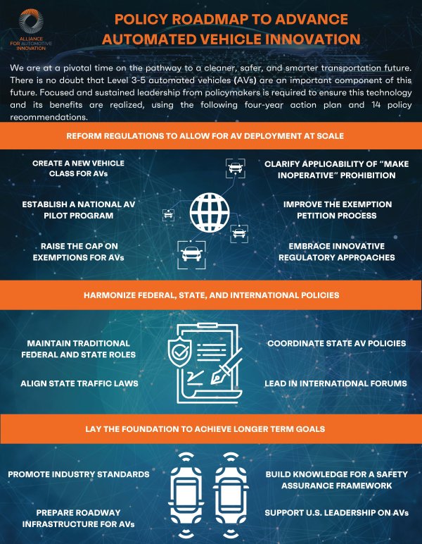 The AV Roadmap includes a four-year plan for supportive government policies to enhance the oversight, testing and deployment of AVs and includes 14 specific recommendations addressing the following pillars: reform regulations to allow for AV deployment at scale, harmonize federal, state, and international policies, and laying the foundation to achieve longer term objectives.