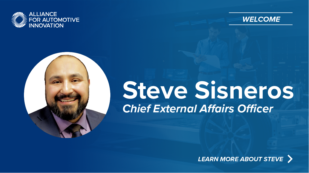 WASHINGTON, DC – Alliance for Automotive Innovation today named Steve Sisneros as Chief External Affairs Officer, effective immediately. Sisneros will oversee all external and research activities and lead the association’s digital advocacy and mobilization strategy across the country.
